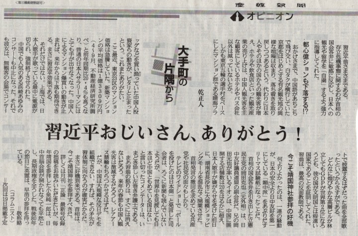 等々いいことが多い。筆者は首相に「今こそ靖国神社へ」とまで言っている。私も「習近平さんにありがとう」と言いたい。