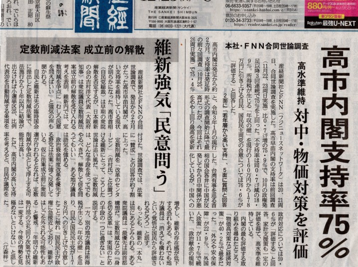 12.23 産経以外の某朝日新聞他オールドメディア、反日親中政党の某岡田議員他、反日媚中某橋下コメンテーター他が、「高市下げ」をやればやるほど高市内閣の支持率が上がる。