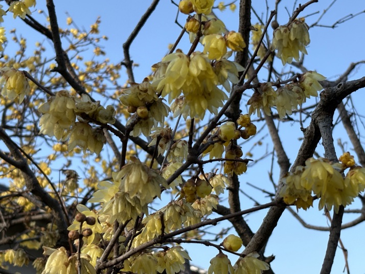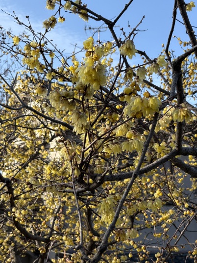 2.14 散歩deカシヤ 透明感のある淡い黄色、梅かなと思いきや、よく見ると違うみたい。4380歩 (蝋梅でした)