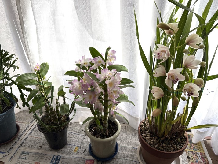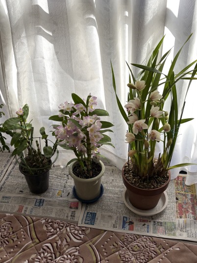 2.20 散歩deカシヤ 我が家のラン、シンピジウム大成功、デンドロは今ひとつ、真ん中は12月買ったやつ まだ咲いています。4167歩
